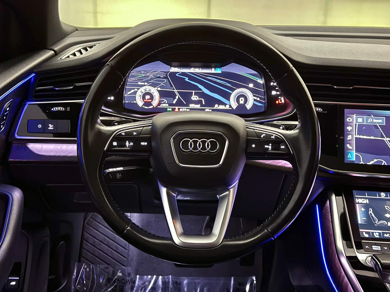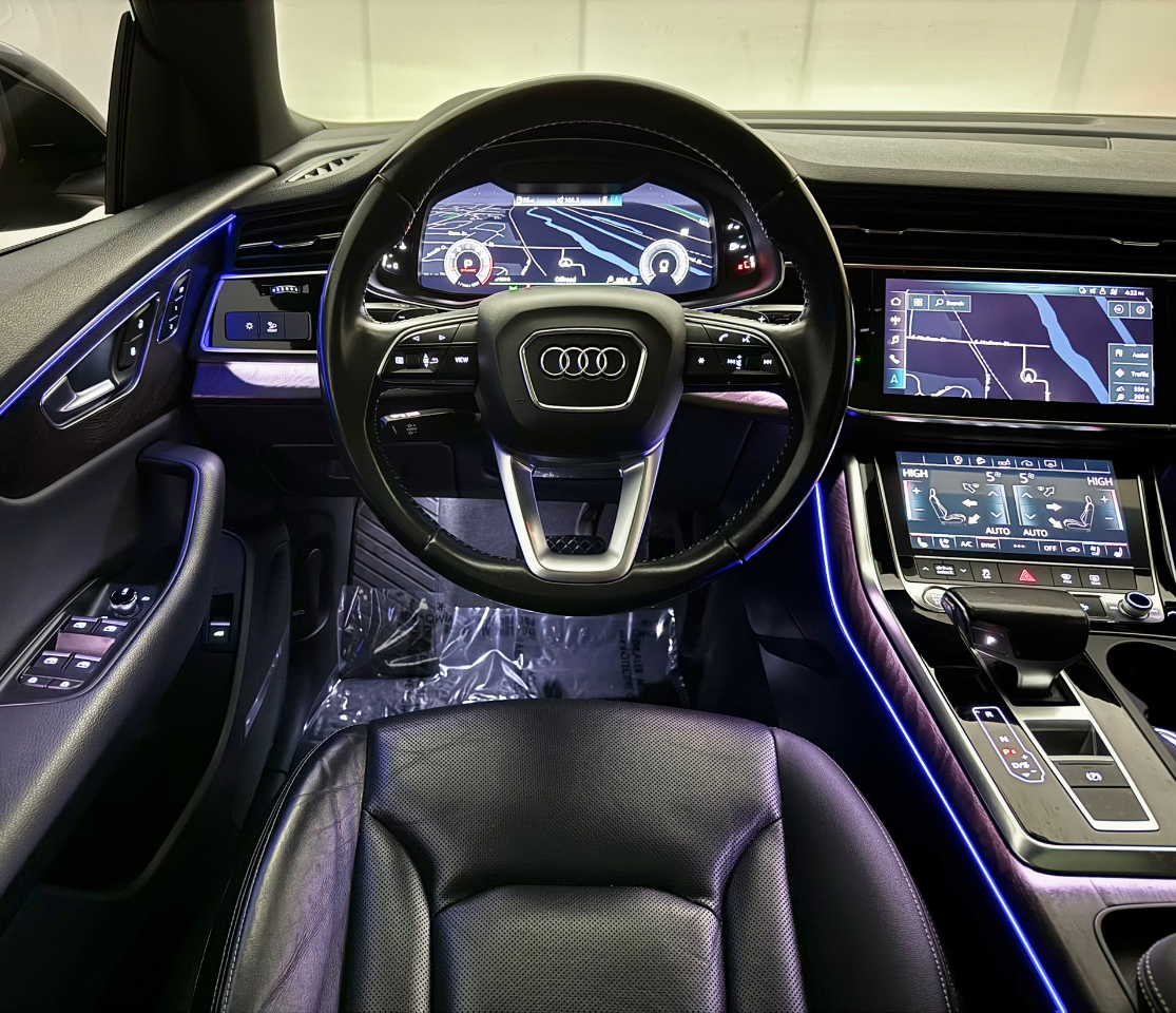 Let's paint the town black with this sleek and sophisticated 2019 Audi Q8. This beauty is the epitome of luxury, with its alluring black exterior that demands attention wherever it goes. The striking design of the Audi Q8 is sure to turn heads and make a statement on the road, showing off its bold lines and elegant curves.